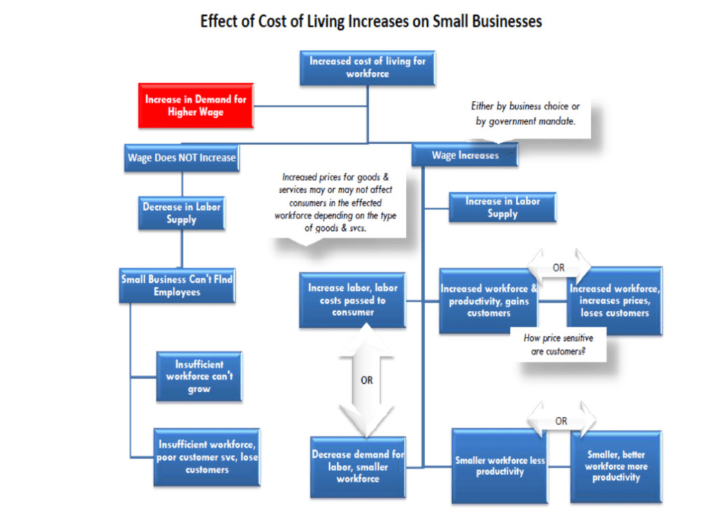 To address the cost of living, government used the tools in its box through minimum wage increases. Government encourages disposable income for the general public since the masses [are supposed to] drive a balanced supply and demand economy. To incentivize the average consumer’s spending, government lowers interest rates or mandates changes in pay. Mandates are rarely welcomed by businesses because it takes away freedom to troubleshoot issues yet the problem being overlooked is the rising cost of living and its effects on both small businesses and communities where homelessness and crime are on the rise.